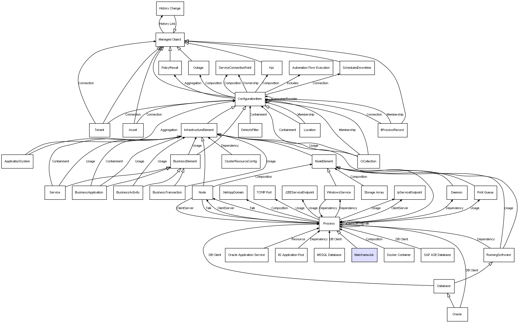 | ConfigurationItem | ServiceConnectionPoint | Composition | Represents a relation between 2 objects where one is contained within the other, and the included object can not exist without its container. Therefore, when the container is deleted, all its contained object will be automatically removed |