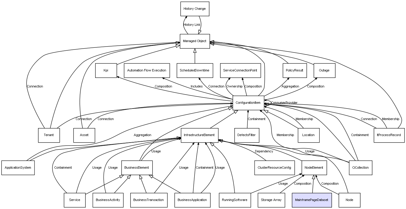 | ConfigurationItem | Outage | Composition | Represents a relation between 2 objects where one is contained within the other, and the included object can not exist without its container. Therefore, when the container is deleted, all its contained object will be automatically removed |