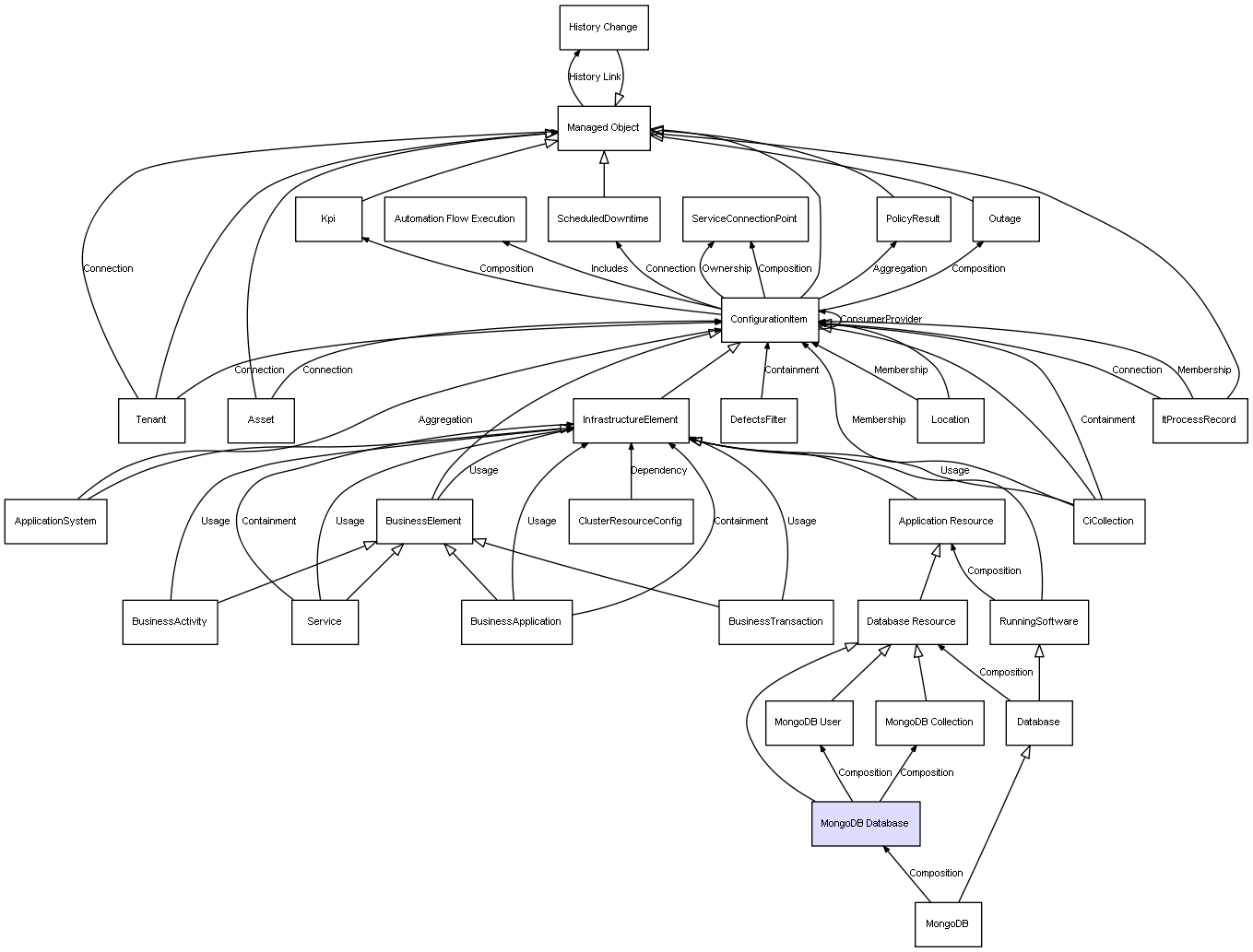 | MongoDB Database | MongoDB User | Composition | Represents a relation between 2 objects where one is contained within the other, and the included object can not exist without its container. Therefore, when the container is deleted, all its contained object will be automatically removed |