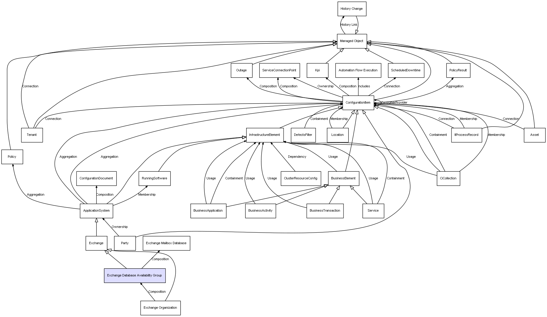 | Exchange Organization | Exchange Database Availability Group | Composition | Represents a relation between 2 objects where one is contained within the other, and the included object can not exist without its container. Therefore, when the container is deleted, all its contained object will be automatically removed |