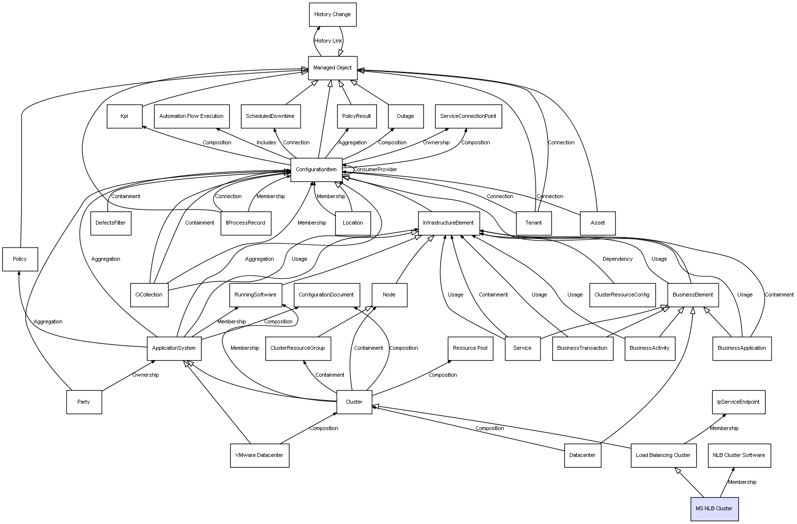 | Cluster | ConfigurationDocument | Composition | Represents a relation between 2 objects where one is contained within the other, and the included object can not exist without its container. Therefore, when the container is deleted, all its contained object will be automatically removed |