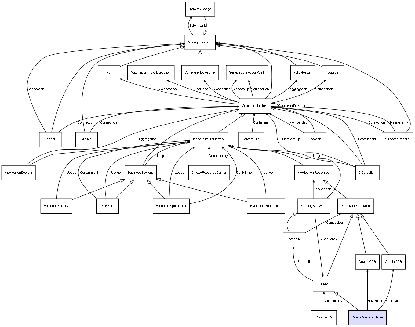 | ConfigurationItem | ServiceConnectionPoint | Composition | Represents a relation between 2 objects where one is contained within the other, and the included object can not exist without its container. Therefore, when the container is deleted, all its contained object will be automatically removed |