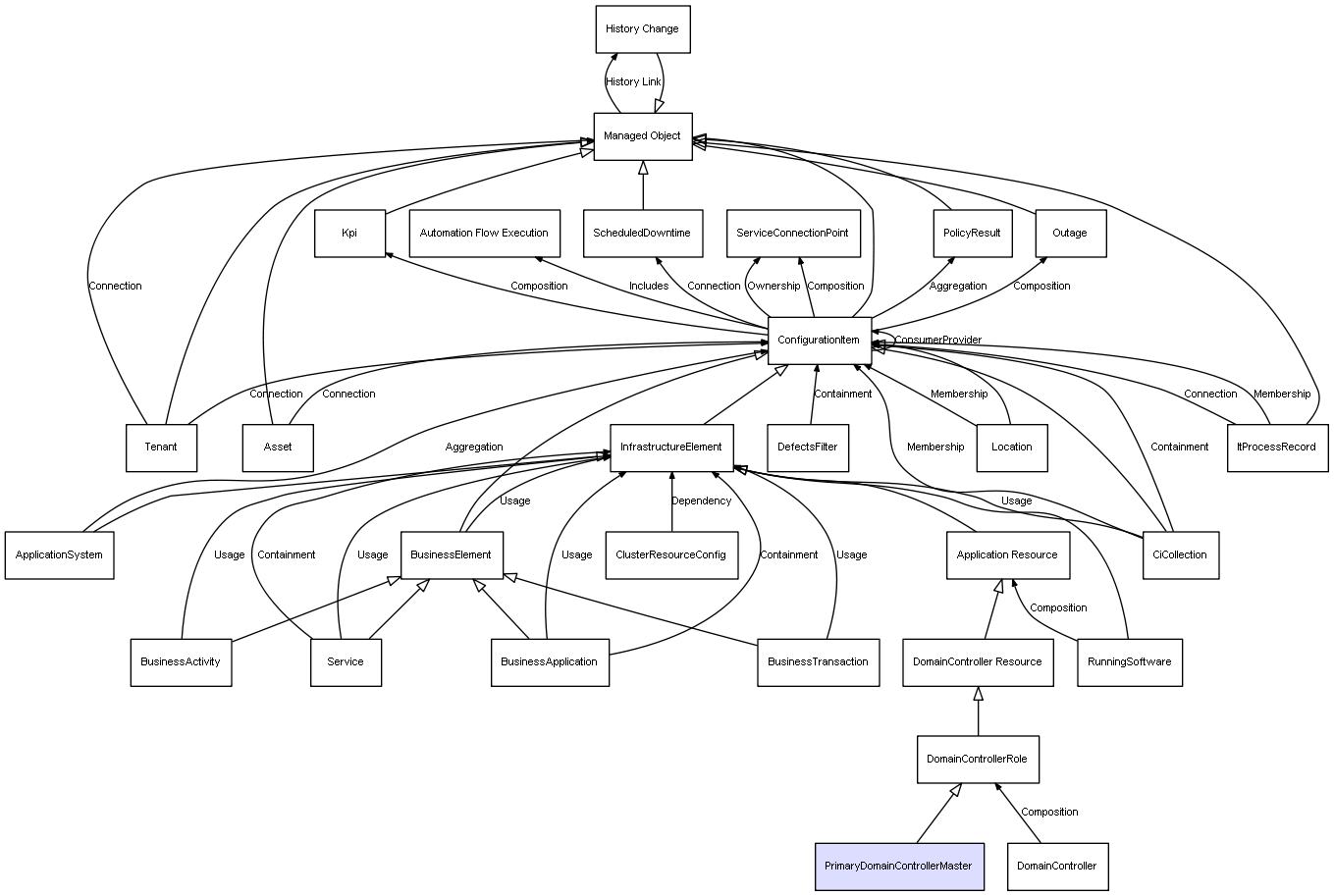 | ConfigurationItem | ServiceConnectionPoint | Composition | Represents a relation between 2 objects where one is contained within the other, and the included object can not exist without its container. Therefore, when the container is deleted, all its contained object will be automatically removed |