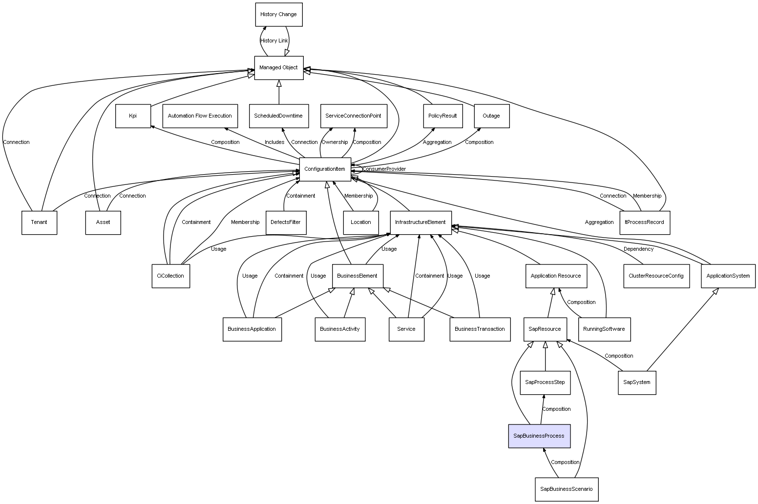 | SapSystem | SapResource | Composition | Represents a relation between 2 objects where one is contained within the other, and the included object can not exist without its container. Therefore, when the container is deleted, all its contained object will be automatically removed |