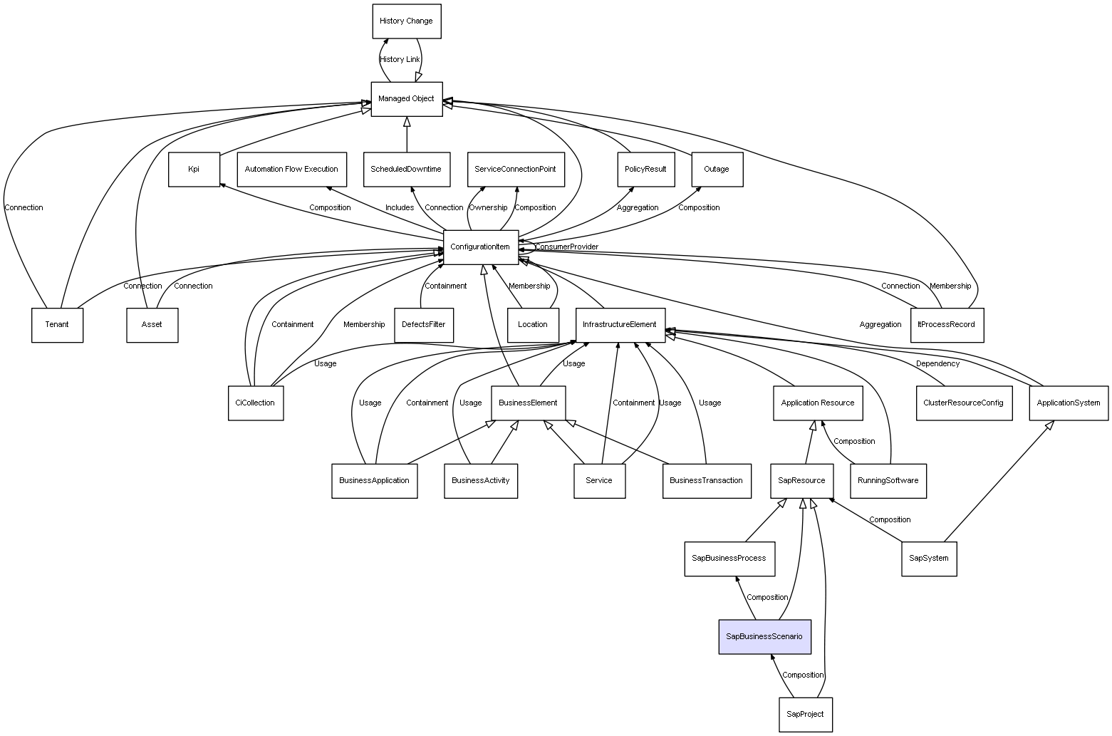 | SapSystem | SapResource | Composition | Represents a relation between 2 objects where one is contained within the other, and the included object can not exist without its container. Therefore, when the container is deleted, all its contained object will be automatically removed |