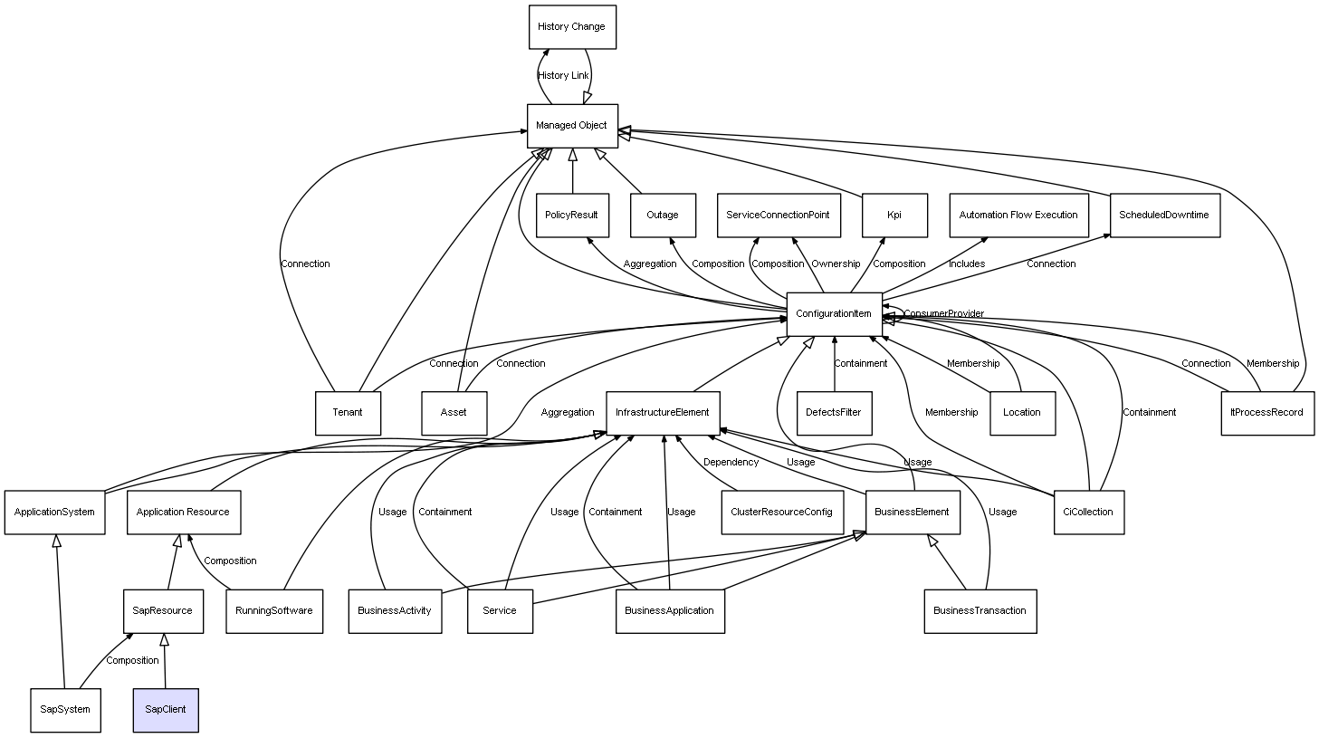 | SapSystem | SapResource | Composition | Represents a relation between 2 objects where one is contained within the other, and the included object can not exist without its container. Therefore, when the container is deleted, all its contained object will be automatically removed |