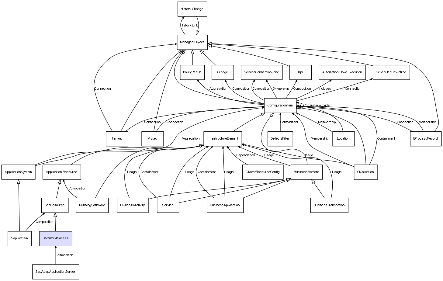 | SapAbapApplicationServer | SapWorkProcess | Composition | Represents a relation between 2 objects where one is contained within the other, and the included object can not exist without its container. Therefore, when the container is deleted, all its contained object will be automatically removed |