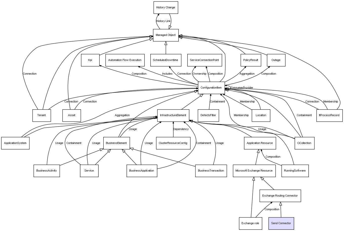 | ConfigurationItem | ServiceConnectionPoint | Composition | Represents a relation between 2 objects where one is contained within the other, and the included object can not exist without its container. Therefore, when the container is deleted, all its contained object will be automatically removed |