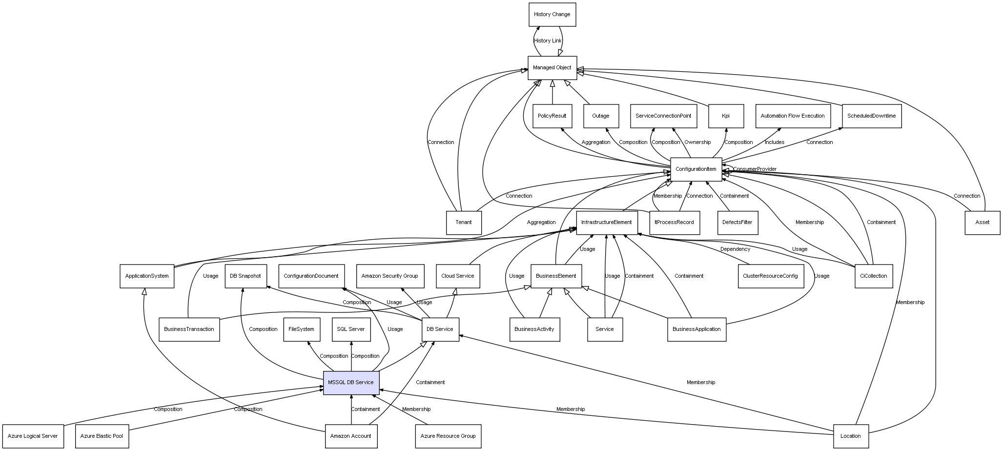 | MSSQL DB Service | DB Snapshot | Composition | Represents a relation between 2 objects where one is contained within the other, and the included object can not exist without its container. Therefore, when the container is deleted, all its contained object will be automatically removed |