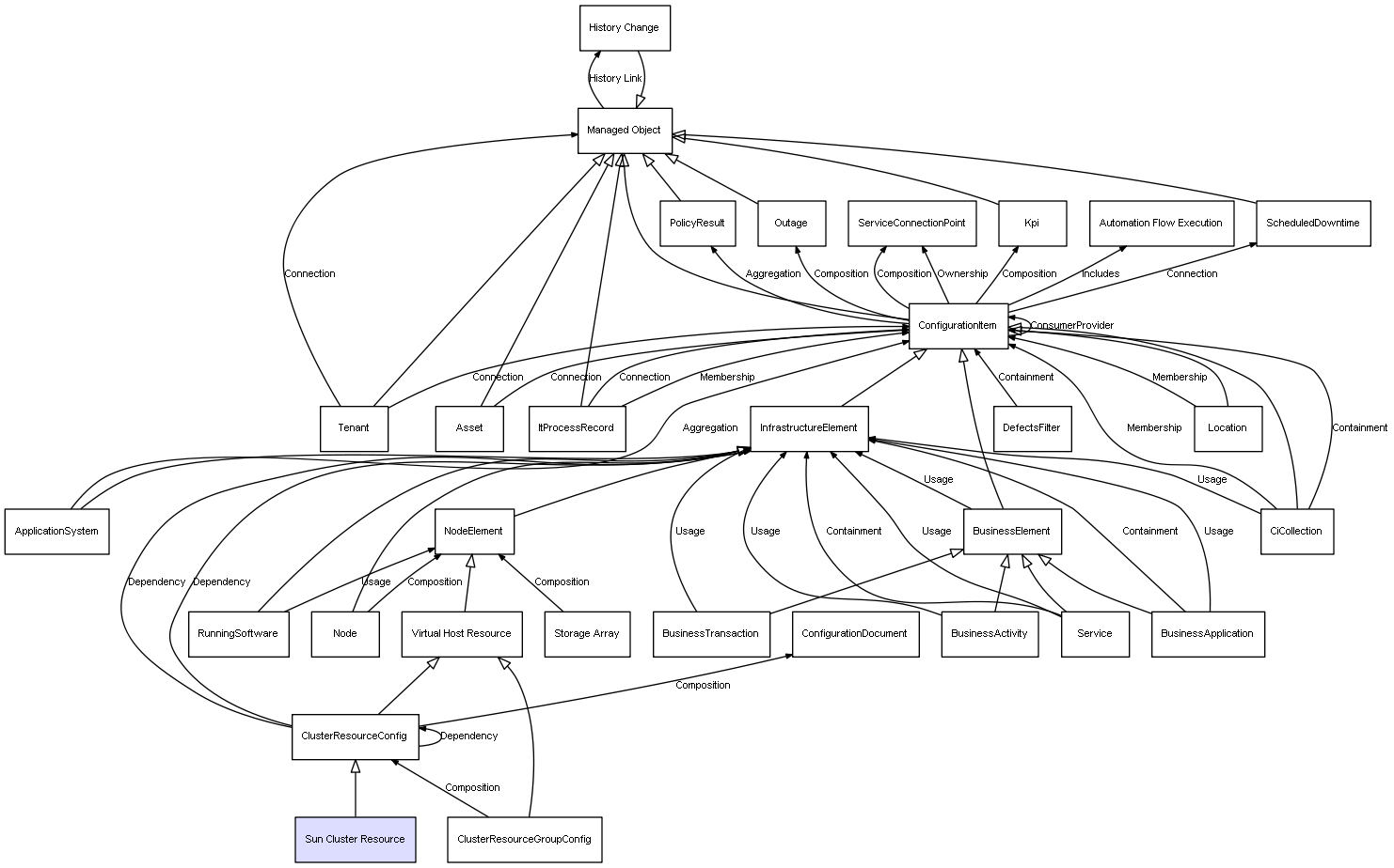 | ClusterResourceConfig | ConfigurationDocument | Composition | Represents a relation between 2 objects where one is contained within the other, and the included object can not exist without its container. Therefore, when the container is deleted, all its contained object will be automatically removed |