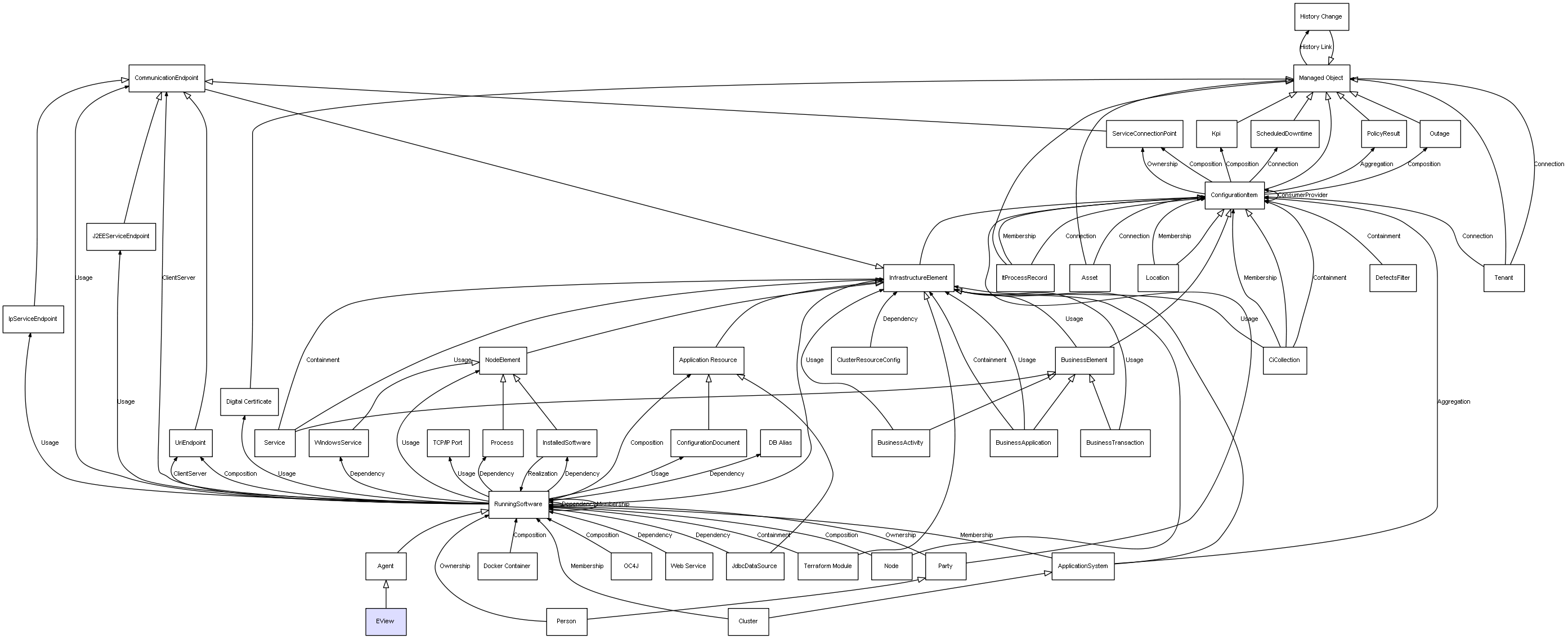 | ConfigurationItem | ServiceConnectionPoint | Composition | Represents a relation between 2 objects where one is contained within the other, and the included object can not exist without its container. Therefore, when the container is deleted, all its contained object will be automatically removed |