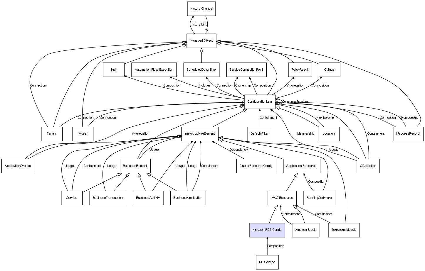 | DB Service | Amazon RDS Config | Composition | Represents a relation between 2 objects where one is contained within the other, and the included object can not exist without its container. Therefore, when the container is deleted, all its contained object will be automatically removed |