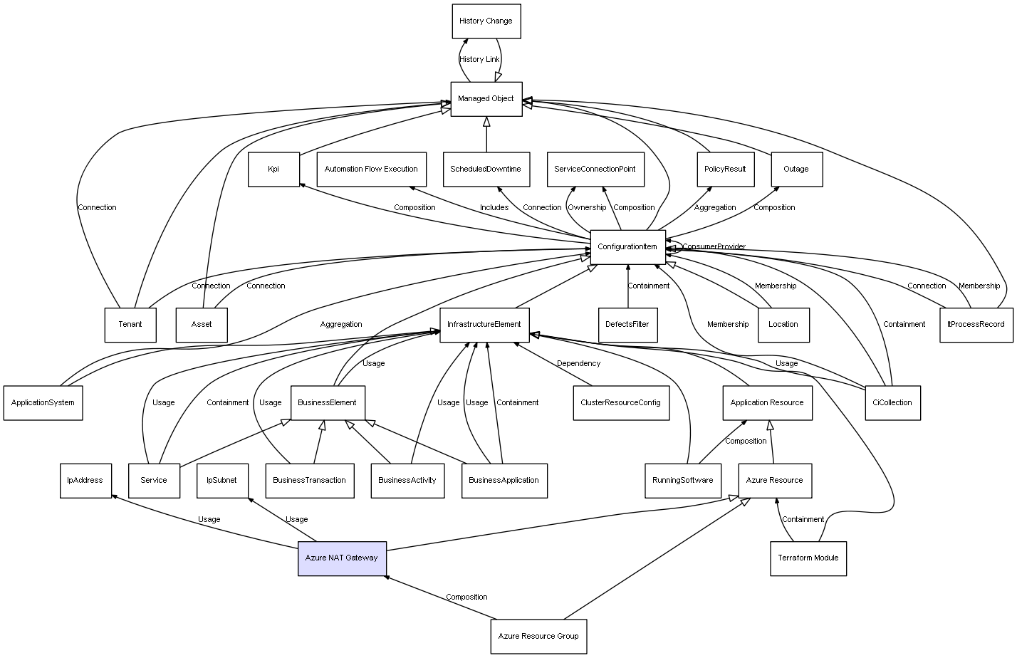 | Azure Resource Group | Azure NAT Gateway | Composition | Represents a relation between 2 objects where one is contained within the other, and the included object can not exist without its container. Therefore, when the container is deleted, all its contained object will be automatically removed |
