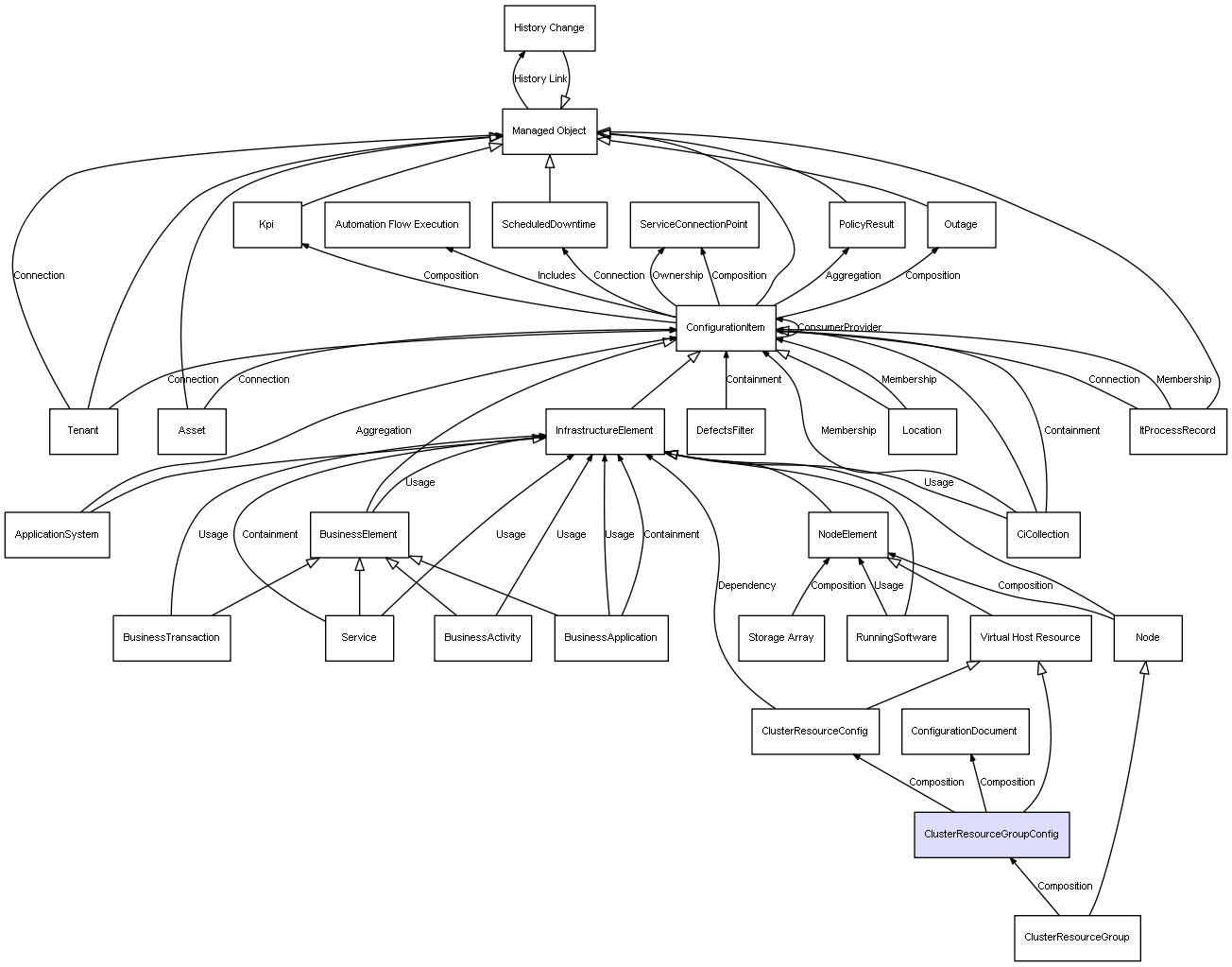 | ClusterResourceGroupConfig | ConfigurationDocument | Composition | Represents a relation between 2 objects where one is contained within the other, and the included object can not exist without its container. Therefore, when the container is deleted, all its contained object will be automatically removed |