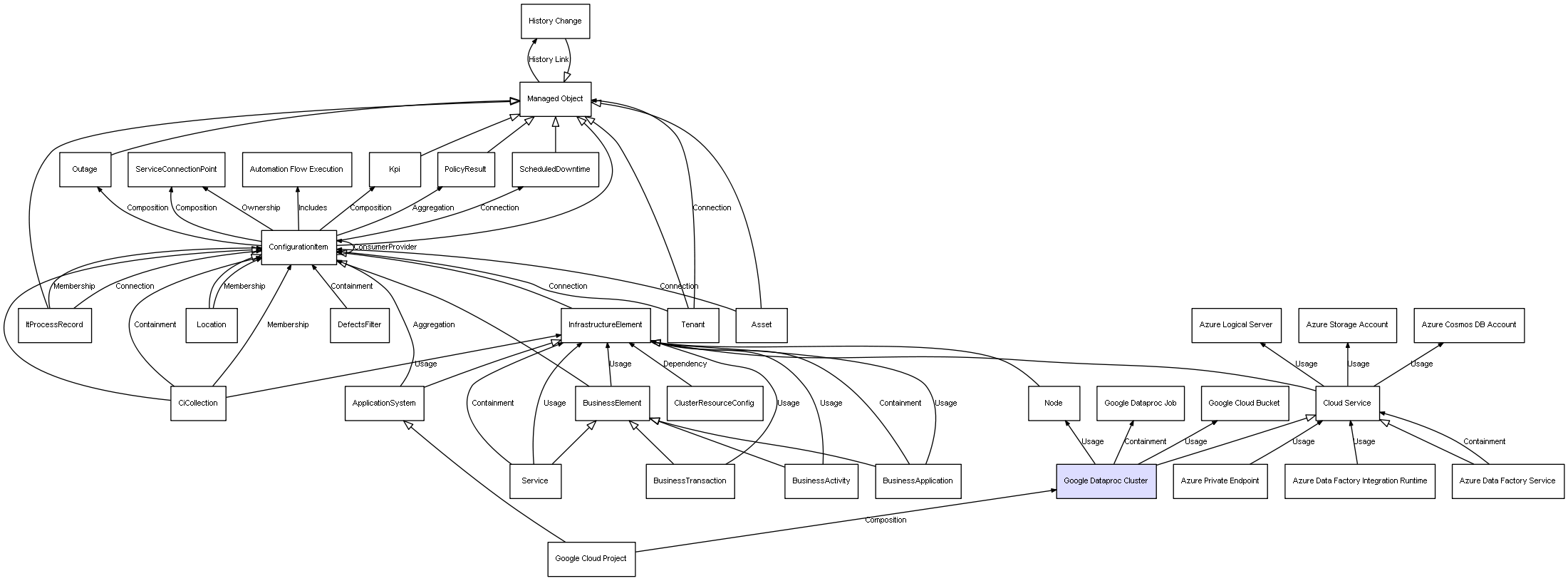 | Google Cloud Project | Google Dataproc Cluster | Composition | Represents a relation between 2 objects where one is contained within the other, and the included object can not exist without its container. Therefore, when the container is deleted, all its contained object will be automatically removed |