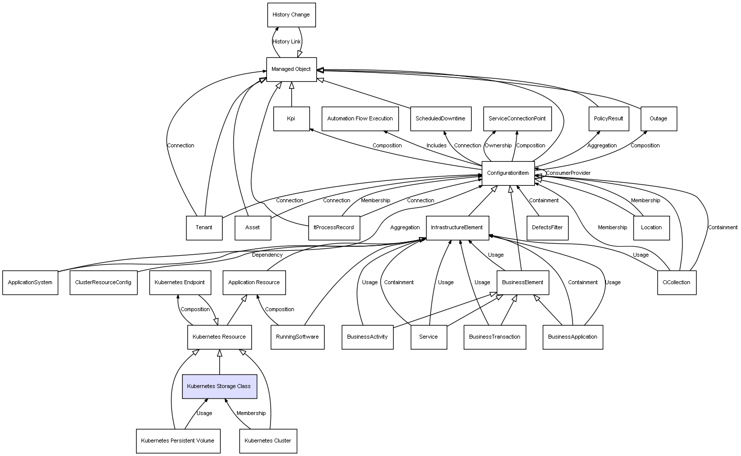 | ConfigurationItem | Outage | Composition | Represents a relation between 2 objects where one is contained within the other, and the included object can not exist without its container. Therefore, when the container is deleted, all its contained object will be automatically removed |