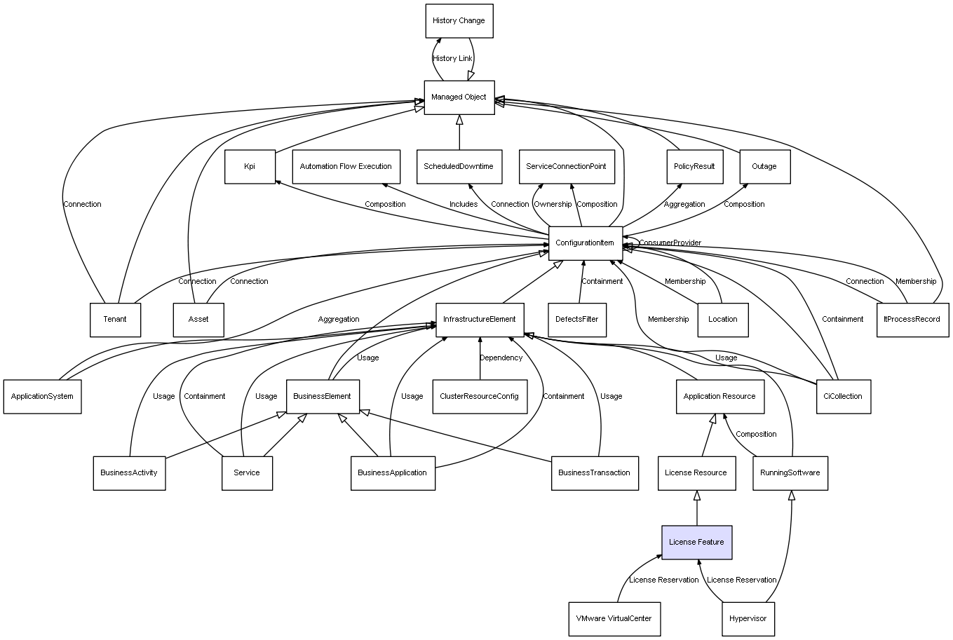 | ConfigurationItem | ServiceConnectionPoint | Composition | Represents a relation between 2 objects where one is contained within the other, and the included object can not exist without its container. Therefore, when the container is deleted, all its contained object will be automatically removed |