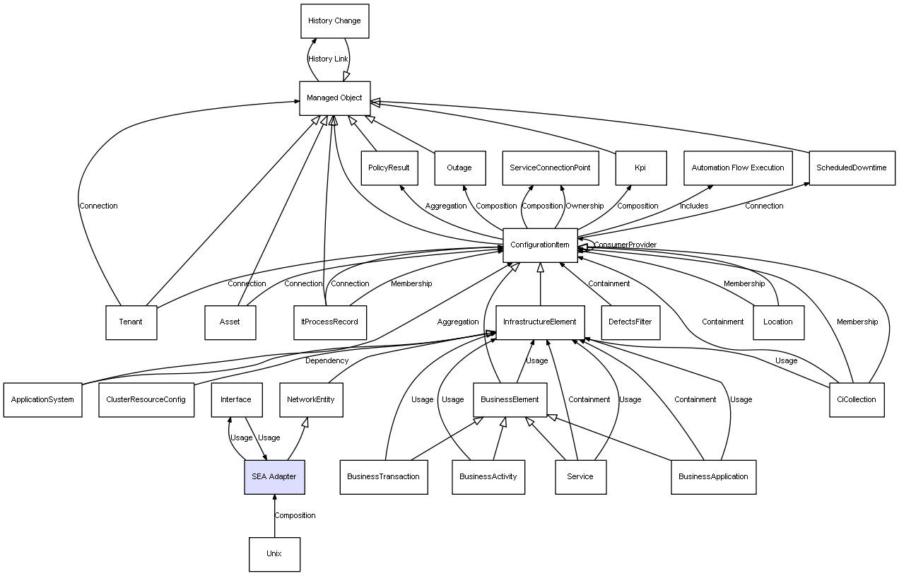 | Unix | SEA Adapter | Composition | Represents a relation between 2 objects where one is contained within the other, and the included object can not exist without its container. Therefore, when the container is deleted, all its contained object will be automatically removed |