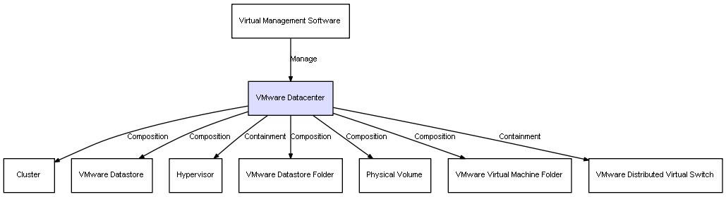 | VMware Datacenter | VMware Datastore | Composition | Represents a relation between 2 objects where one is contained within the other, and the included object can not exist without its container. Therefore, when the container is deleted, all its contained object will be automatically removed |