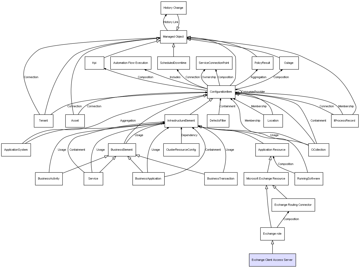 | Exchange role | Exchange Routing Connector | Composition | Represents a relation between 2 objects where one is contained within the other, and the included object can not exist without its container. Therefore, when the container is deleted, all its contained object will be automatically removed |