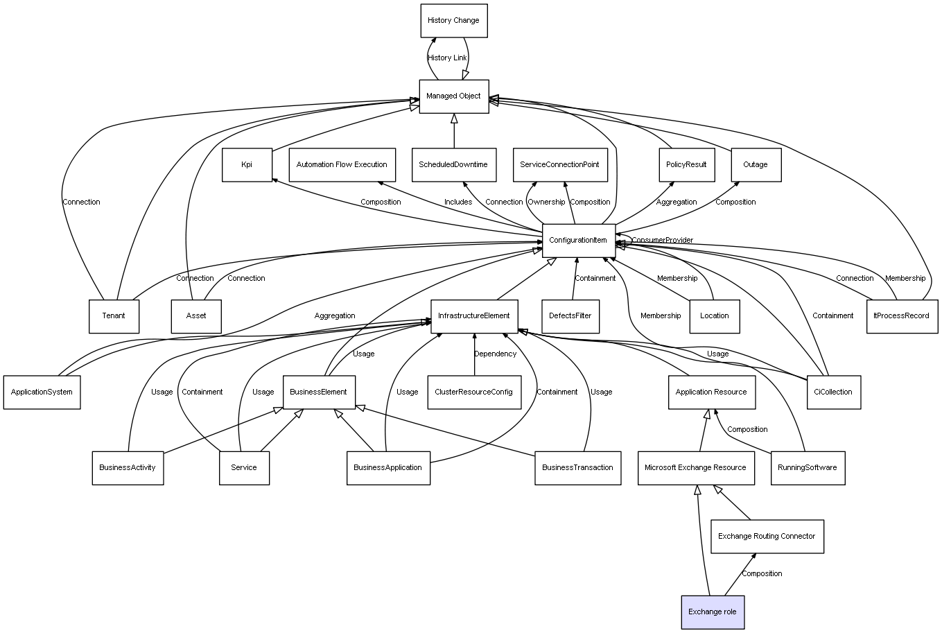 | Exchange role | Exchange Routing Connector | Composition | Represents a relation between 2 objects where one is contained within the other, and the included object can not exist without its container. Therefore, when the container is deleted, all its contained object will be automatically removed |
