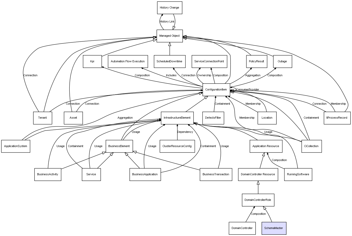 | ConfigurationItem | ServiceConnectionPoint | Composition | Represents a relation between 2 objects where one is contained within the other, and the included object can not exist without its container. Therefore, when the container is deleted, all its contained object will be automatically removed |