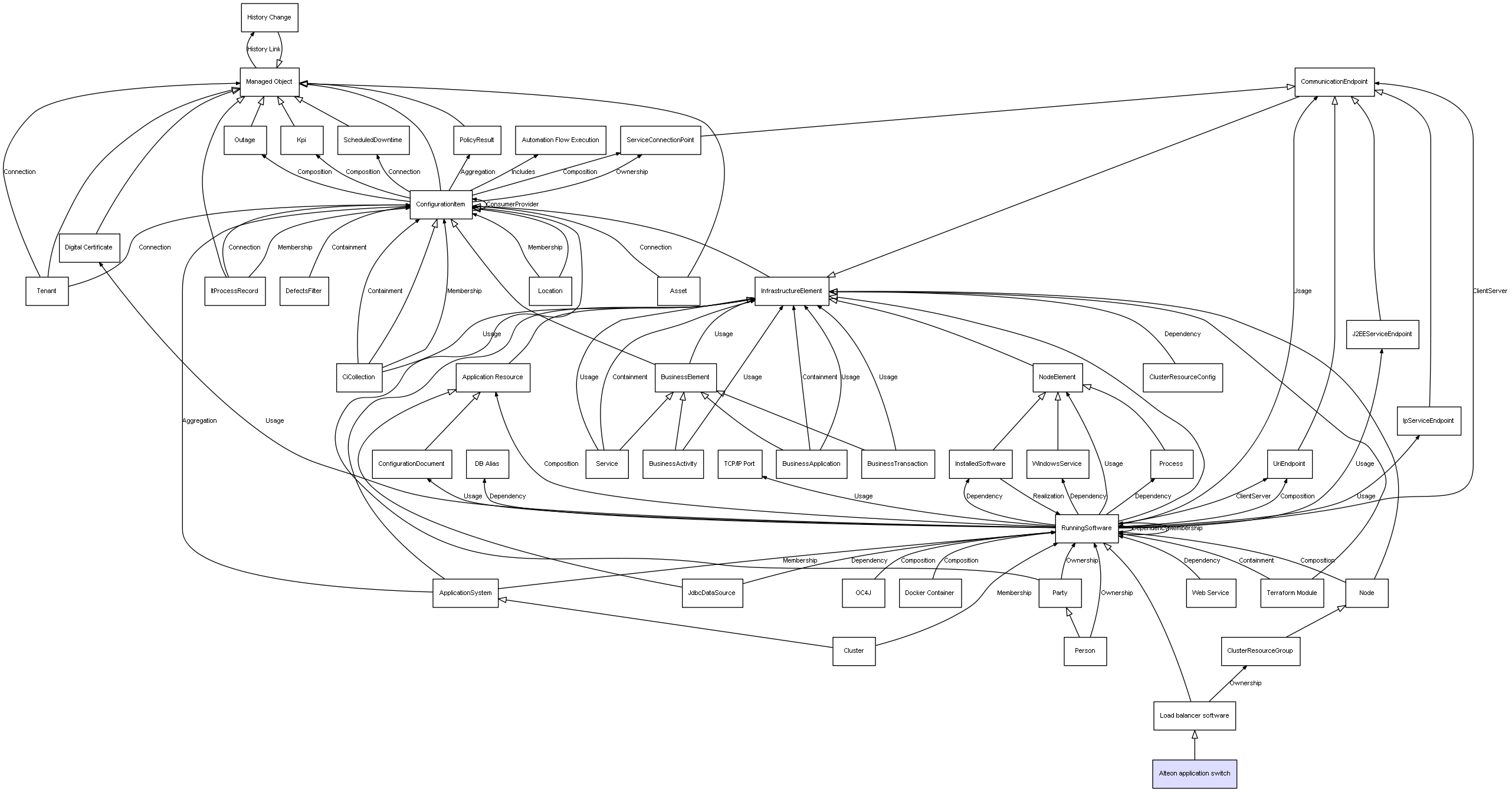 | ConfigurationItem | ServiceConnectionPoint | Composition | Represents a relation between 2 objects where one is contained within the other, and the included object can not exist without its container. Therefore, when the container is deleted, all its contained object will be automatically removed |