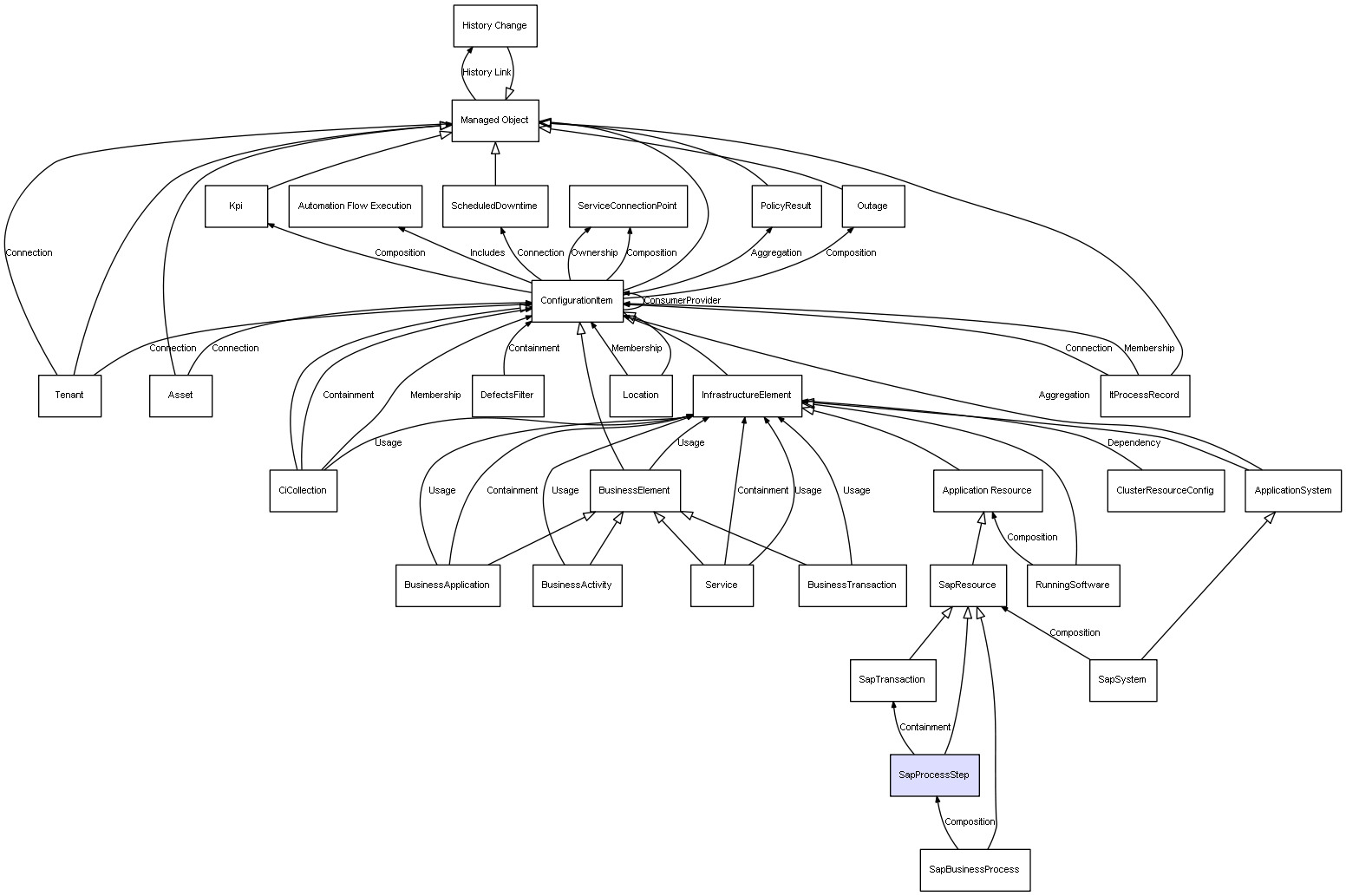 | SapSystem | SapResource | Composition | Represents a relation between 2 objects where one is contained within the other, and the included object can not exist without its container. Therefore, when the container is deleted, all its contained object will be automatically removed |