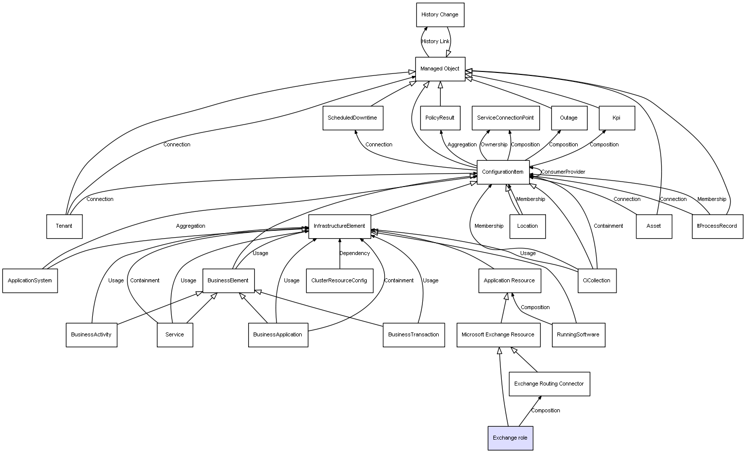 | Exchange role | Exchange Routing Connector | Composition | Represents a relation between 2 objects where one is contained within the other, and the included object can not exist without its container. Therefore, when the container is deleted, all its contained object will be automatically removed |