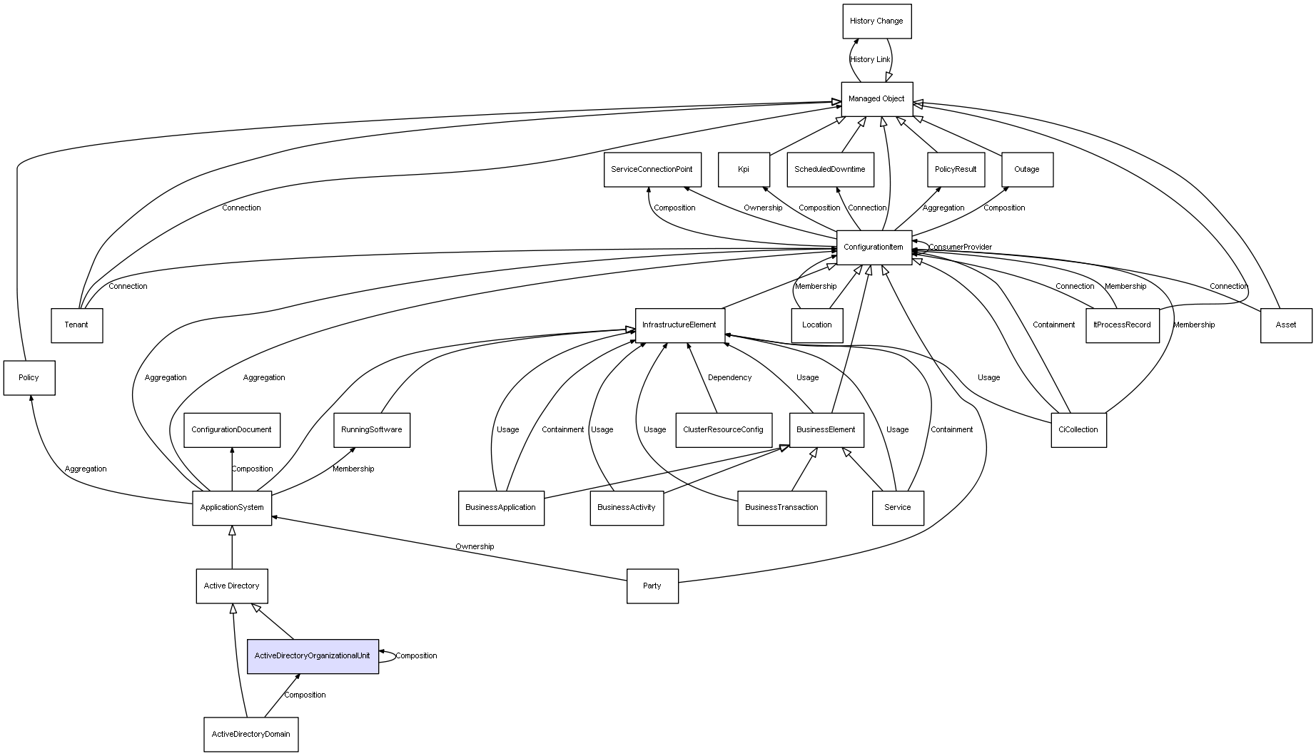 | ActiveDirectoryOrganizationalUnit | ActiveDirectoryOrganizationalUnit | Composition | Represents a relation between 2 objects where one is contained within the other, and the included object can not exist without its container. Therefore, when the container is deleted, all its contained object will be automatically removed |