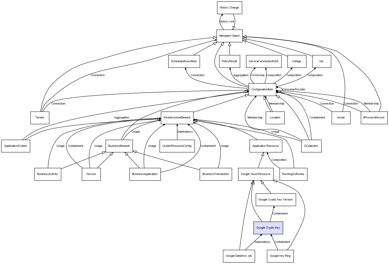 | Google Dataflow Job | Google Crypto Key | Dependency | represents a dependency between 2 objects |