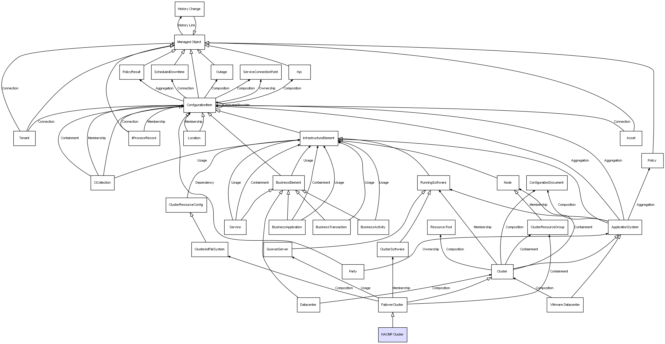 | Cluster | ConfigurationDocument | Composition | Represents a relation between 2 objects where one is contained within the other, and the included object can not exist without its container. Therefore, when the container is deleted, all its contained object will be automatically removed |