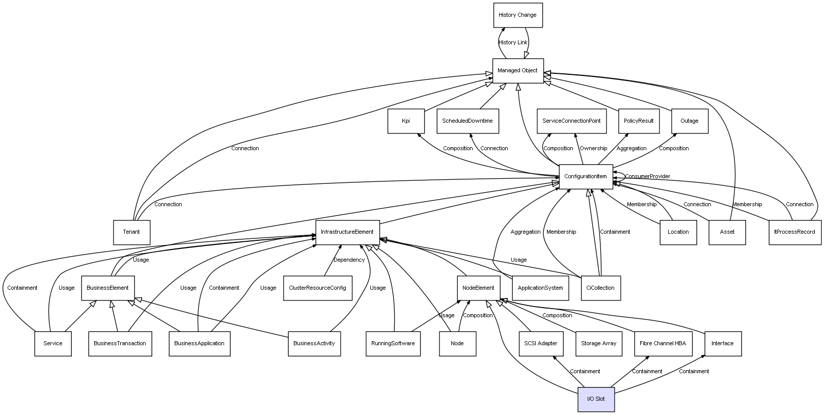 | ConfigurationItem | Outage | Composition | Represents a relation between 2 objects where one is contained within the other, and the included object can not exist without its container. Therefore, when the container is deleted, all its contained object will be automatically removed |