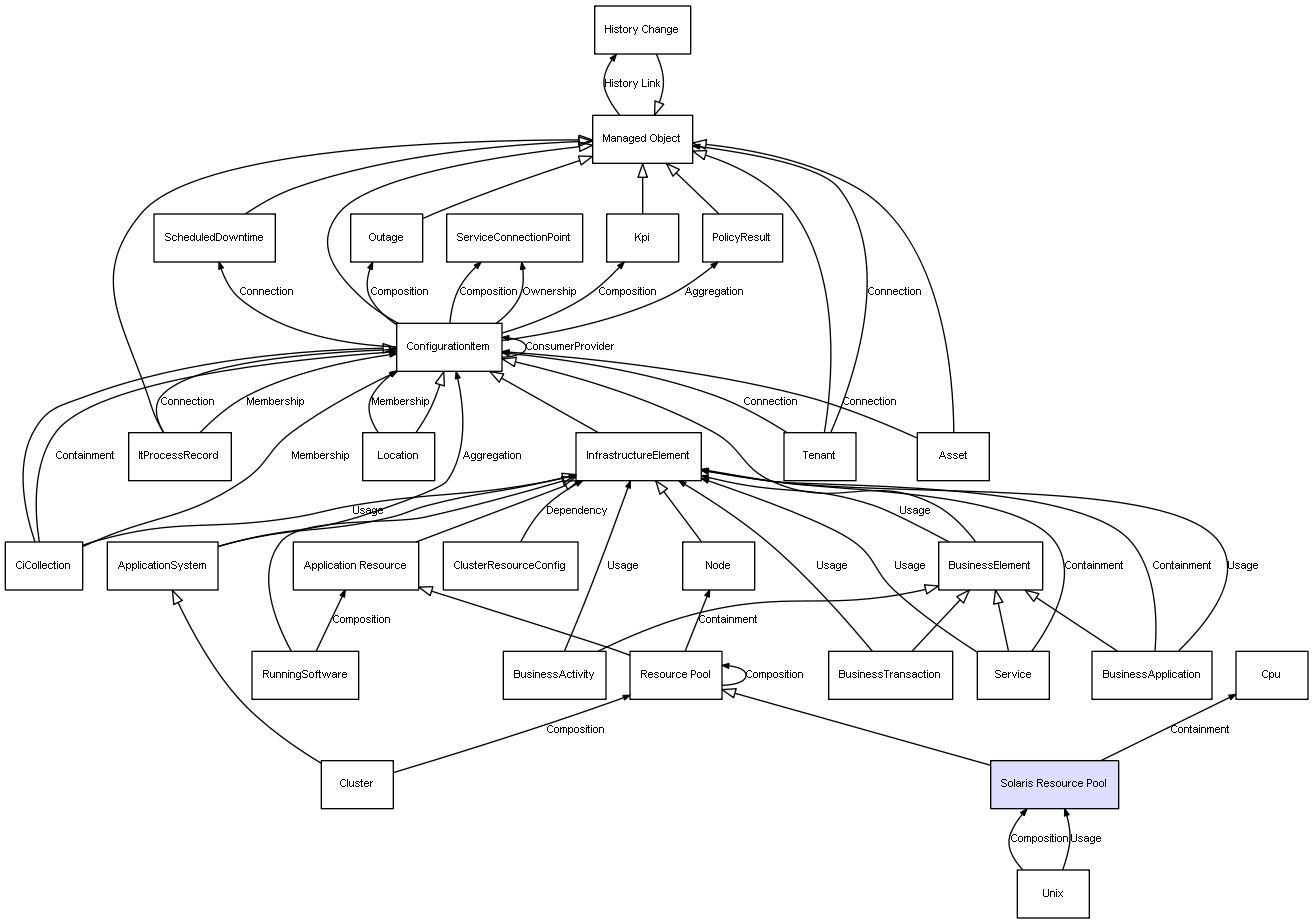 | Unix | Solaris Resource Pool | Composition | Represents a relation between 2 objects where one is contained within the other, and the included object can not exist without its container. Therefore, when the container is deleted, all its contained object will be automatically removed |