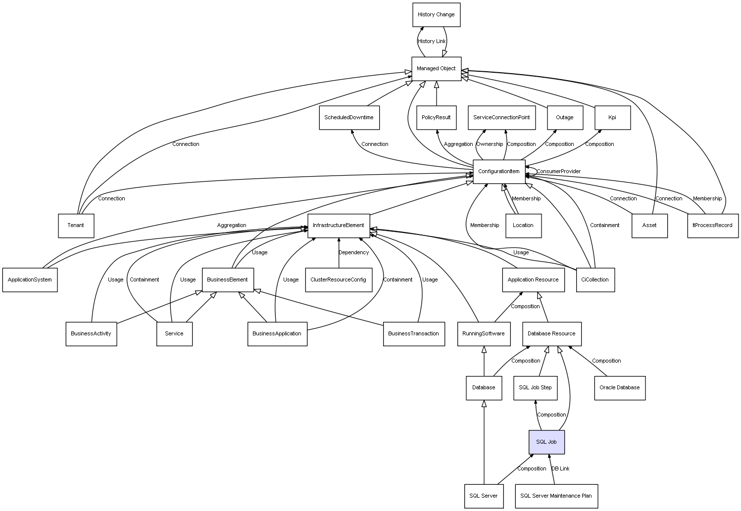 | SQL Job | SQL Job Step | Composition | Represents a relation between 2 objects where one is contained within the other, and the included object can not exist without its container. Therefore, when the container is deleted, all its contained object will be automatically removed |