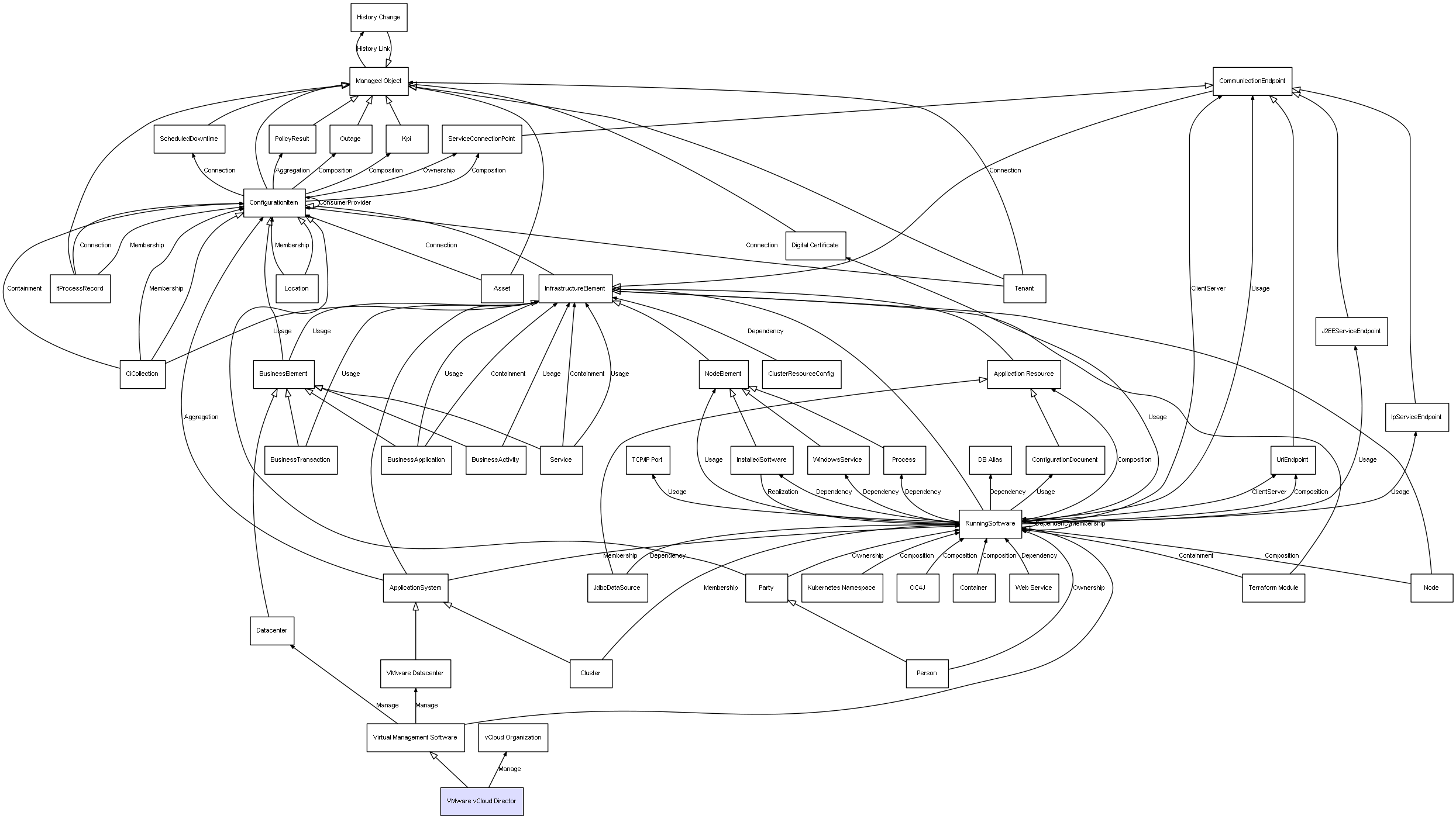 | ConfigurationItem | ServiceConnectionPoint | Composition | Represents a relation between 2 objects where one is contained within the other, and the included object can not exist without its container. Therefore, when the container is deleted, all its contained object will be automatically removed |