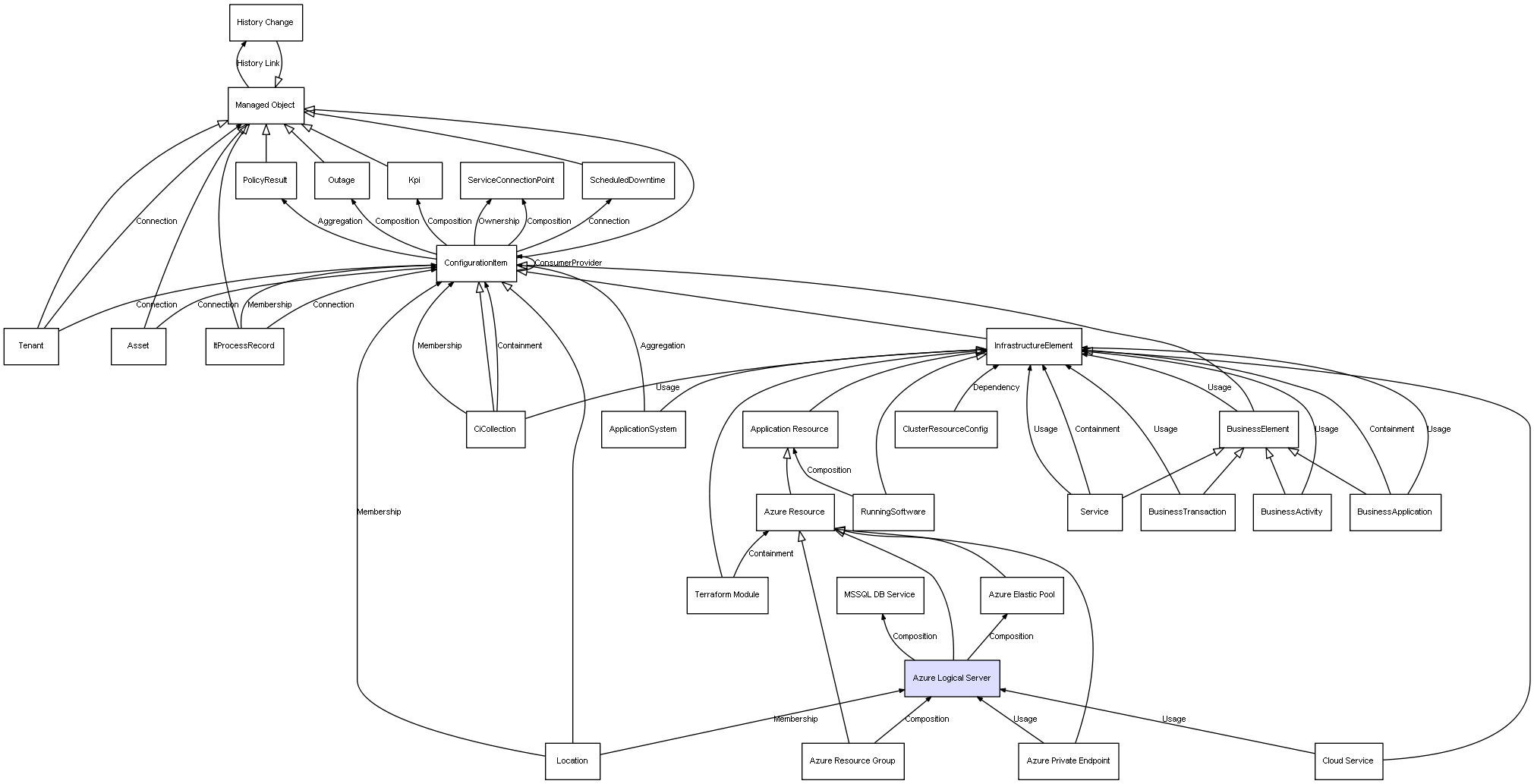 | Azure Logical Server | MSSQL DB Service | Composition | Represents a relation between 2 objects where one is contained within the other, and the included object can not exist without its container. Therefore, when the container is deleted, all its contained object will be automatically removed |