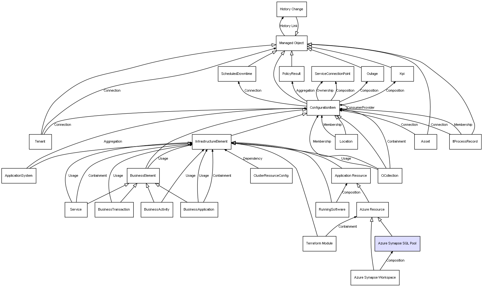 | Azure Synapse Workspace | Azure Synapse SQL Pool | Composition | Represents a relation between 2 objects where one is contained within the other, and the included object can not exist without its container. Therefore, when the container is deleted, all its contained object will be automatically removed |