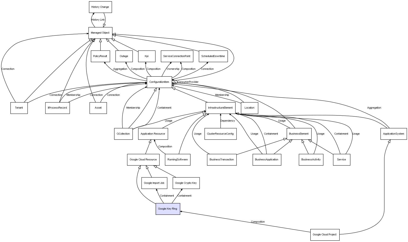 | Google Cloud Project | Google Key Ring | Composition | Represents a relation between 2 objects where one is contained within the other, and the included object can not exist without its container. Therefore, when the container is deleted, all its contained object will be automatically removed |
