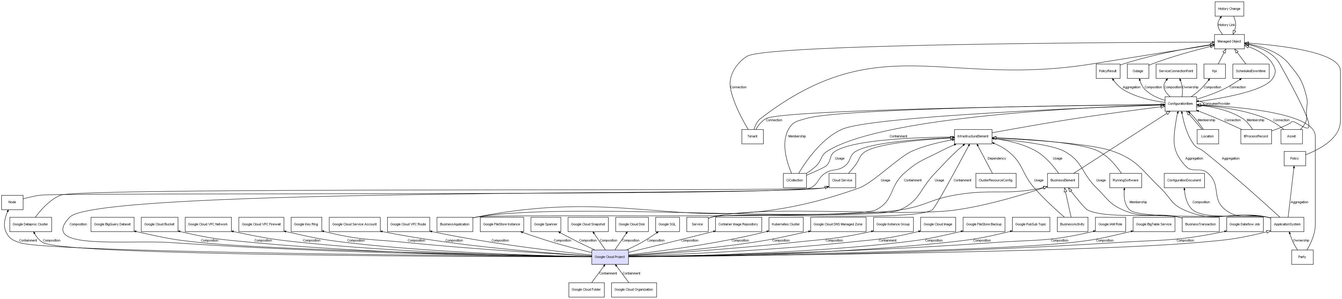 | Google Cloud Project | Cloud Service | Composition | Represents a relation between 2 objects where one is contained within the other, and the included object can not exist without its container. Therefore, when the container is deleted, all its contained object will be automatically removed |