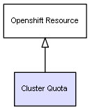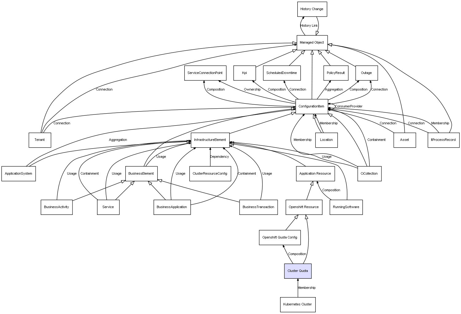 | Cluster Quota | Openshift Quota Config | Composition | Represents a relation between 2 objects where one is contained within the other, and the included object can not exist without its container. Therefore, when the container is deleted, all its contained object will be automatically removed |