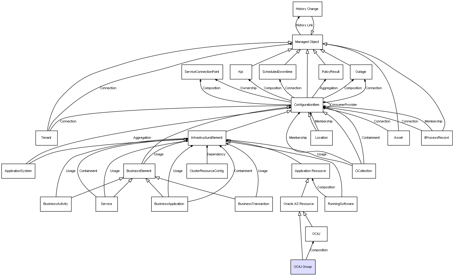 | OC4J Group | OC4J | Composition | Represents a relation between 2 objects where one is contained within the other, and the included object can not exist without its container. Therefore, when the container is deleted, all its contained object will be automatically removed |