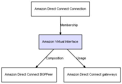 | Amazon Virtual Interface | Amazon Direct Connect BGPPeer | Composition | Represents a relation between 2 objects where one is contained within the other, and the included object can not exist without its container. Therefore, when the container is deleted, all its contained object will be automatically removed |