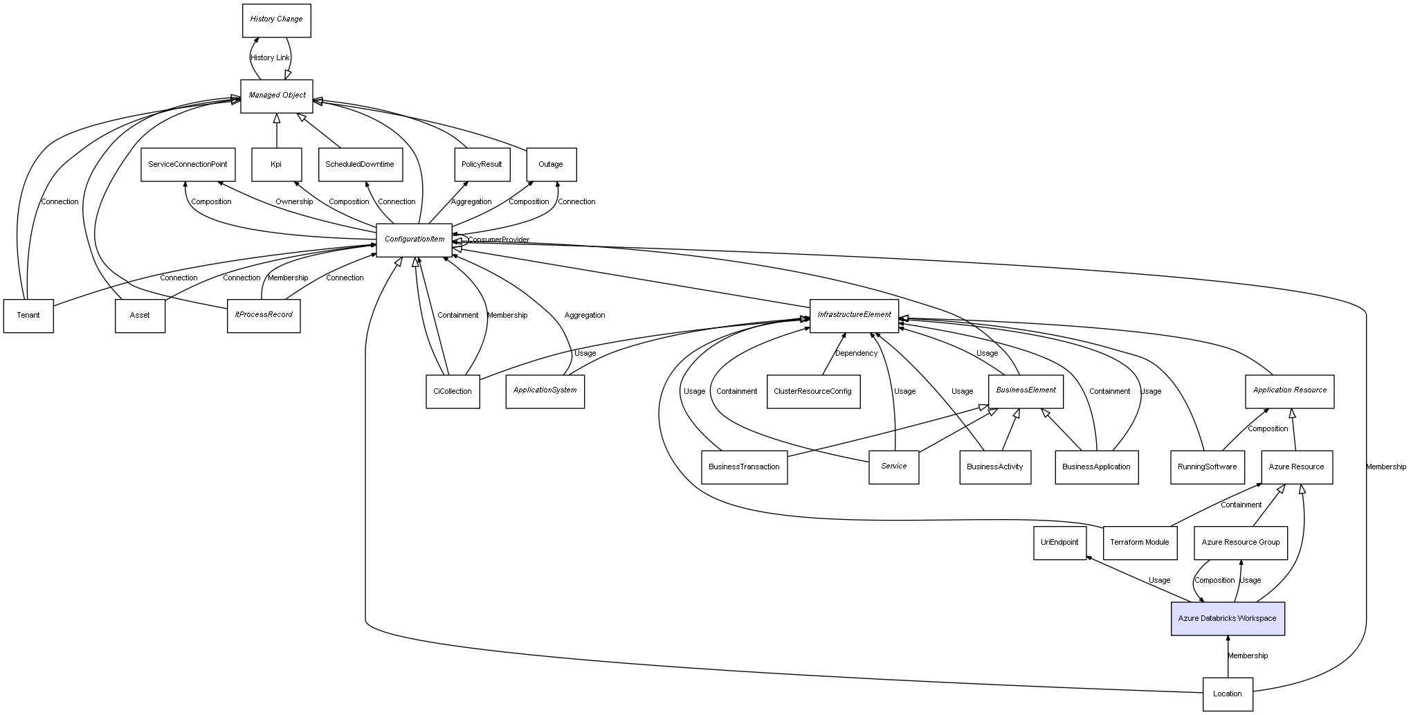 | Azure Resource Group | Azure Databricks Workspace | Composition | Represents a relation between 2 objects where one is contained within the other, and the included object can not exist without its container. Therefore, when the container is deleted, all its contained object will be automatically removed |