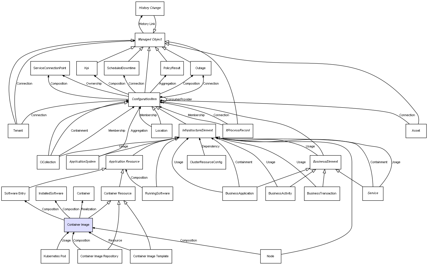 | Node | Container Image | Composition | Represents a relation between 2 objects where one is contained within the other, and the included object can not exist without its container. Therefore, when the container is deleted, all its contained object will be automatically removed |