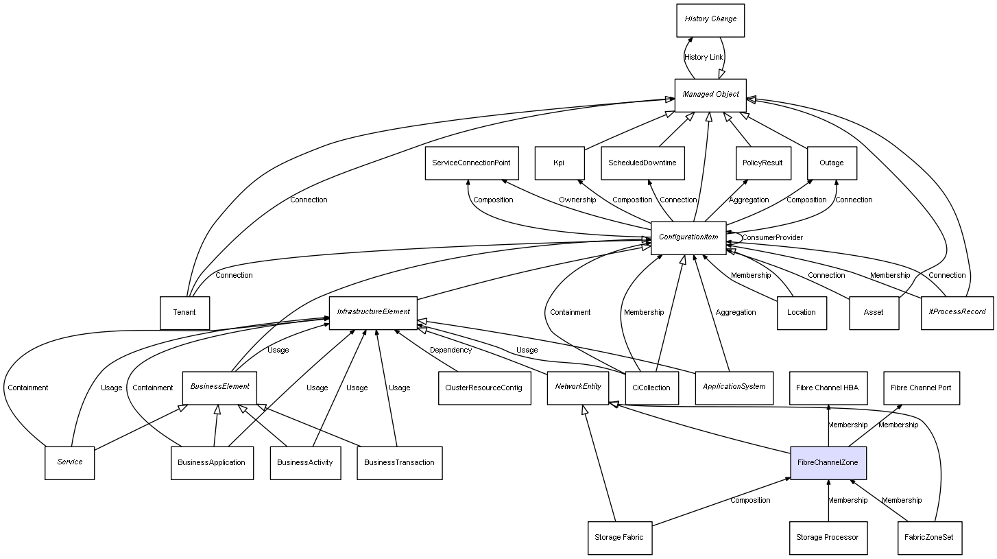 | Storage Fabric | FibreChannelZone | Composition | Represents a relation between 2 objects where one is contained within the other, and the included object can not exist without its container. Therefore, when the container is deleted, all its contained object will be automatically removed |