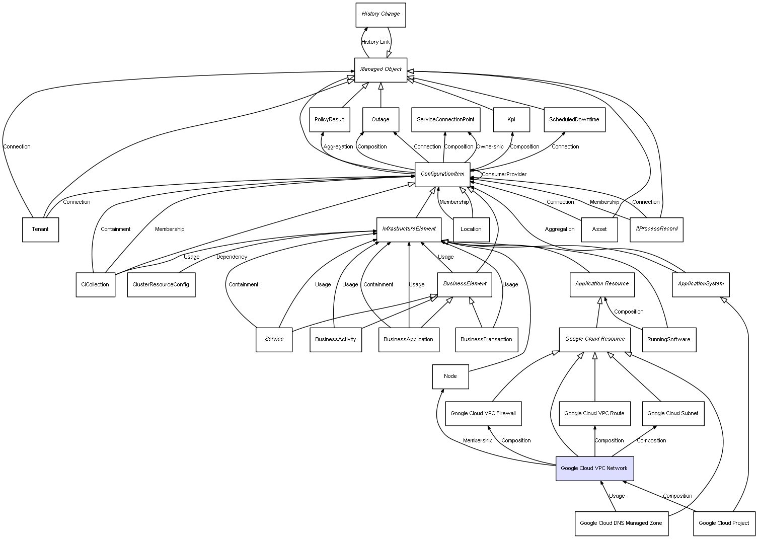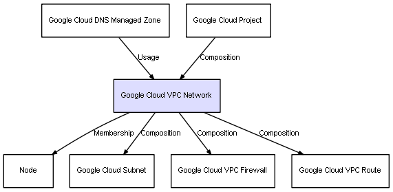 | Google Cloud Project | Google Cloud VPC Network | Composition | Represents a relation between 2 objects where one is contained within the other, and the included object can not exist without its container. Therefore, when the container is deleted, all its contained object will be automatically removed |