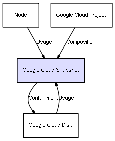 | Google Cloud Project | Google Cloud Snapshot | Composition | Represents a relation between 2 objects where one is contained within the other, and the included object can not exist without its container. Therefore, when the container is deleted, all its contained object will be automatically removed |