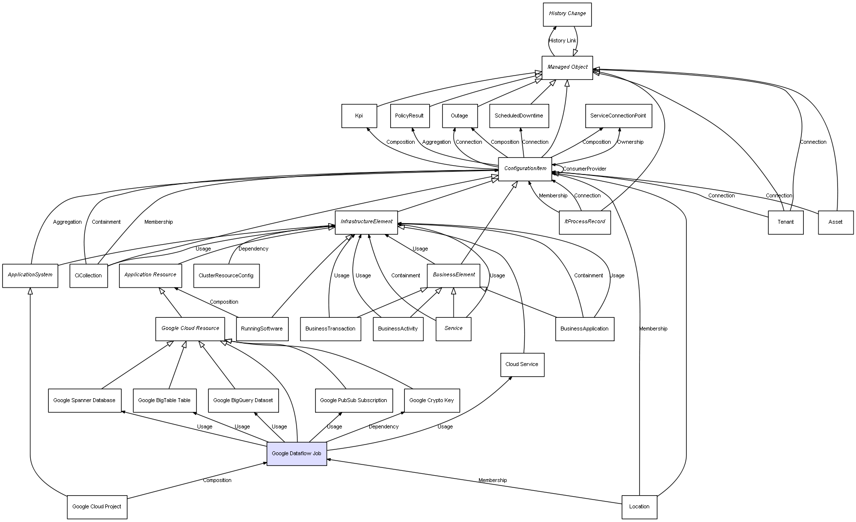 | Google Cloud Project | Google Dataflow Job | Composition | Represents a relation between 2 objects where one is contained within the other, and the included object can not exist without its container. Therefore, when the container is deleted, all its contained object will be automatically removed |