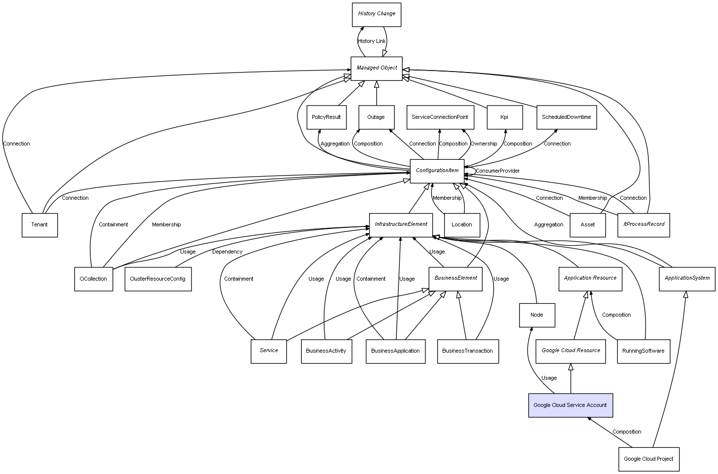 | Google Cloud Project | Google Cloud Service Account | Composition | Represents a relation between 2 objects where one is contained within the other, and the included object can not exist without its container. Therefore, when the container is deleted, all its contained object will be automatically removed |